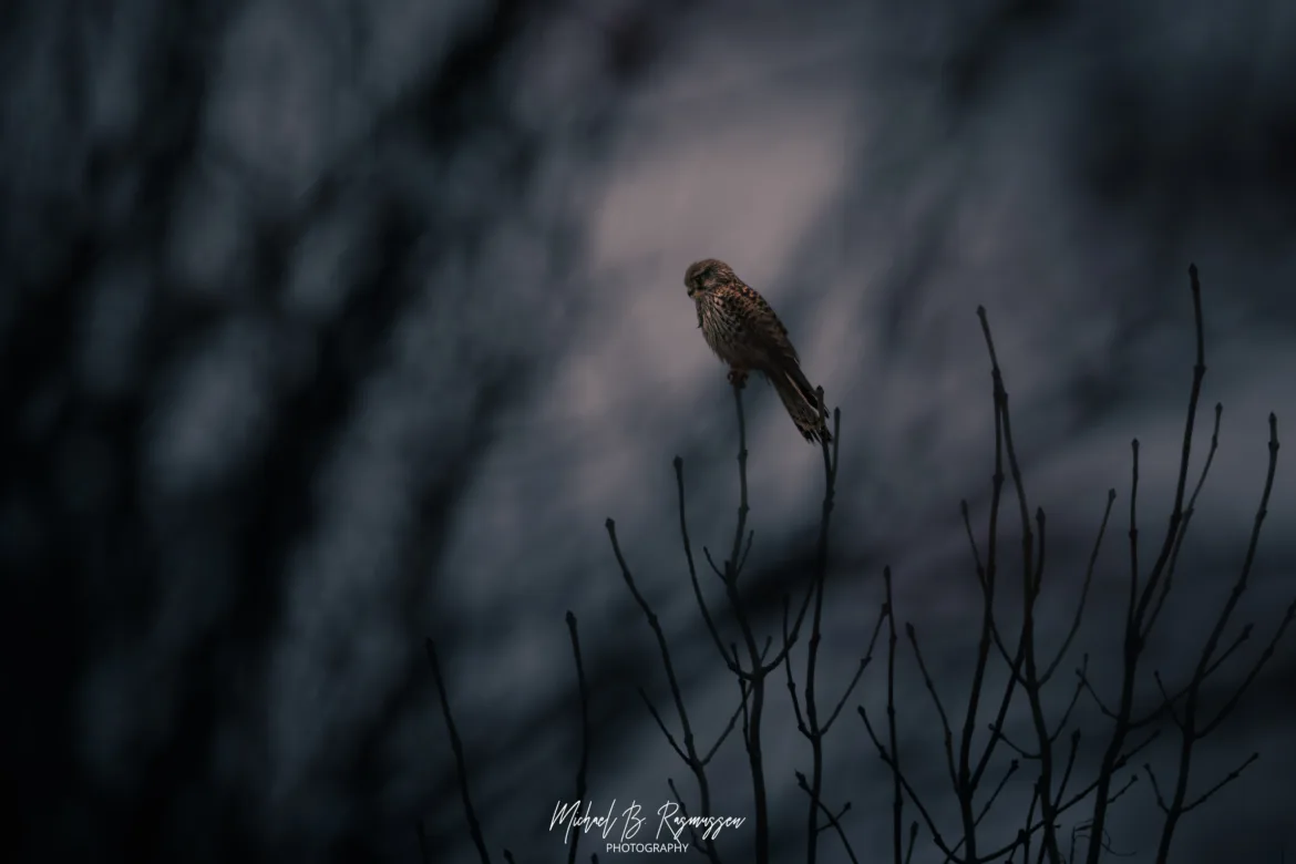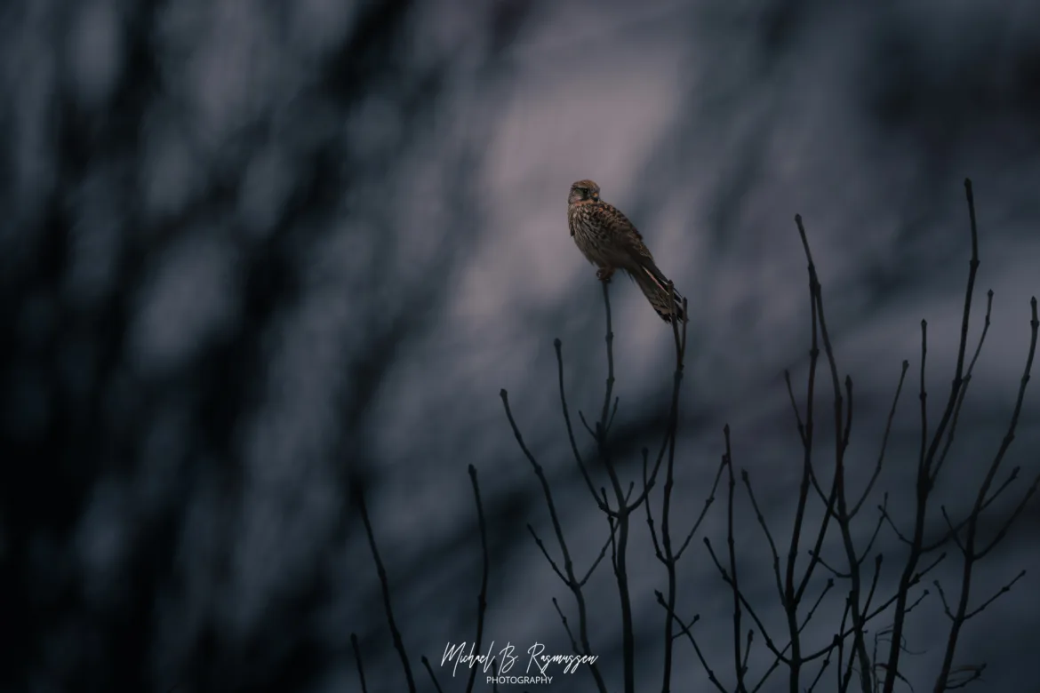 Den sad helt roligt og spejdede ud over landskabet. Det grå og mørke vejr gav billederne en dramatisk og intens stemning, som faktisk klædte rovfuglen utroligt godt. Det var ikke det klassiske solskinsbillede, men noget mere råt og ægte. At stå der, midt i Rønnebæk Søskov, og betragte så elegant en jæger, fik straks kulden og det grå vejr til at forsvinde.