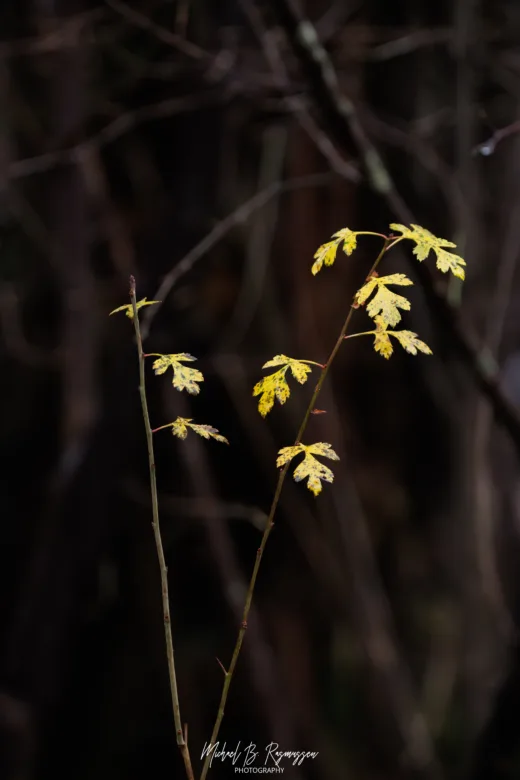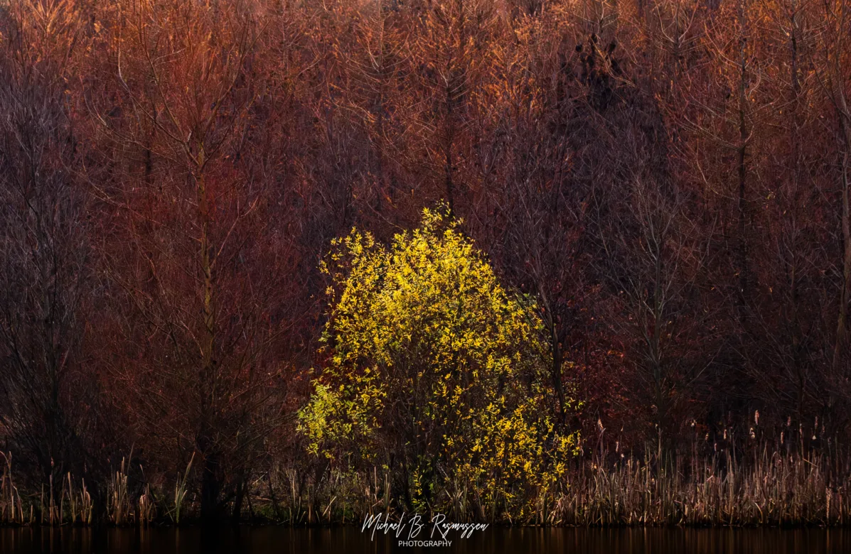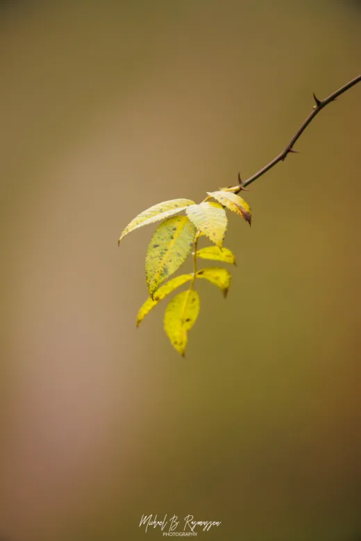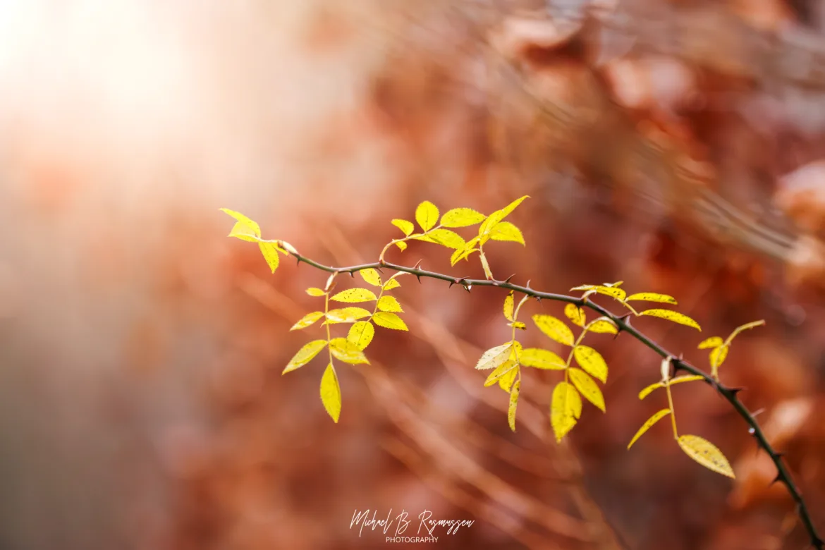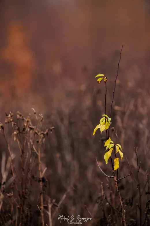 Jeg blev fanget af kontrasterne. De sidste, gyldne blade, der klynger sig til tornede grene, lyser nærmest op som små lanterner mod den mørke baggrund. Der er en særlig melankolsk skønhed over naturens forfald lige nu. Især det enlige, gule træ, der stod og lyste op midt i den rødbrune skovkant, var et fantastisk motiv – en påmindelse om, at der stadig er liv, selvom vinteren har fat.