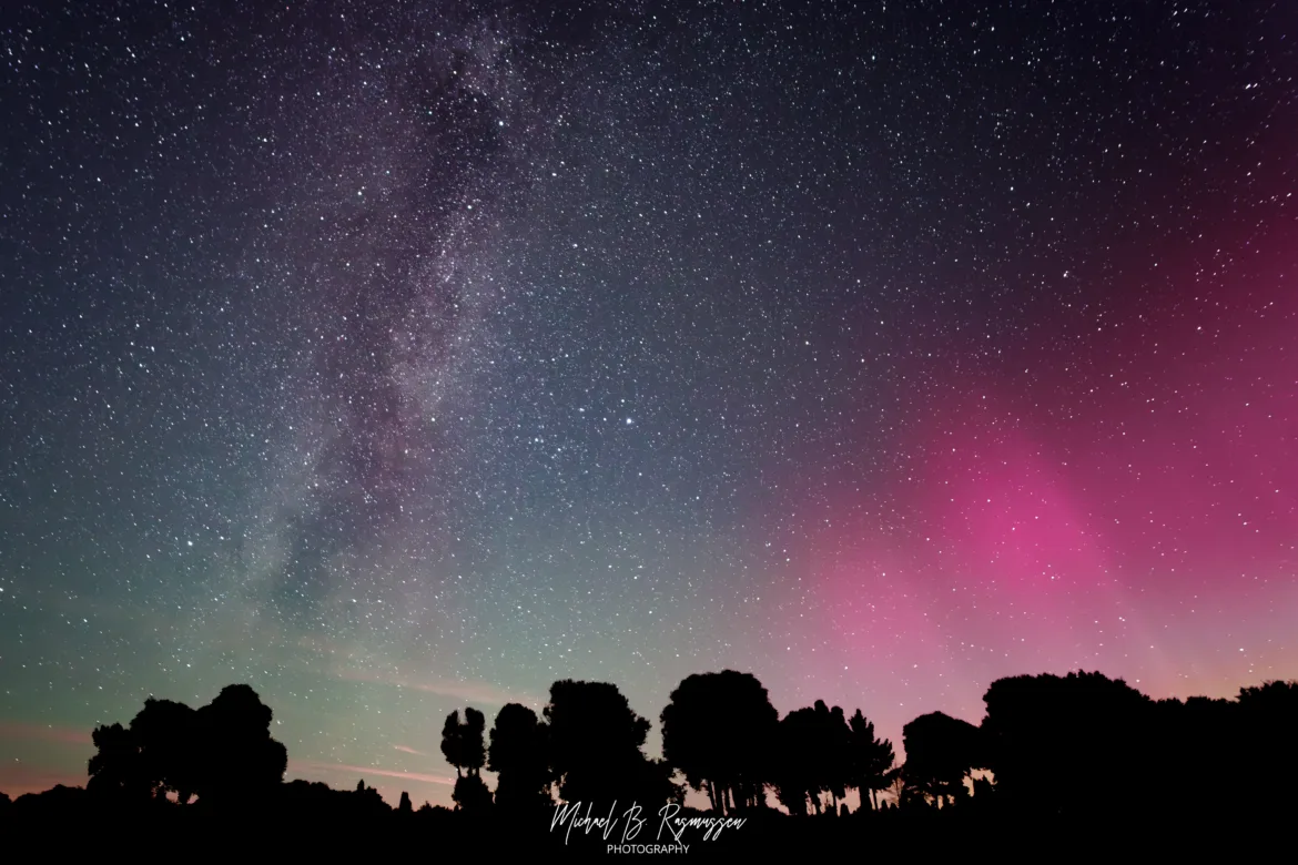 Nordlysets Farvepragt Hvad der gjorde denne nat ekstraordinær, var tilstedeværelsen af nordlyset (Aurora Borealis). Selvom fænomenet oftest er forbundet med de nordligste breddegrader, blev vi forkælet med lysende, pink og rødlige skær i horisonten. Det er naturens eget maleri, et elektrisk fænomen, der farver natten på en måde, som intet kunstværk kan genskabe. Kontrasten mellem Mælkevejens sarte guldtoner og nordlysets intense magenta er simpelthen betagende.
