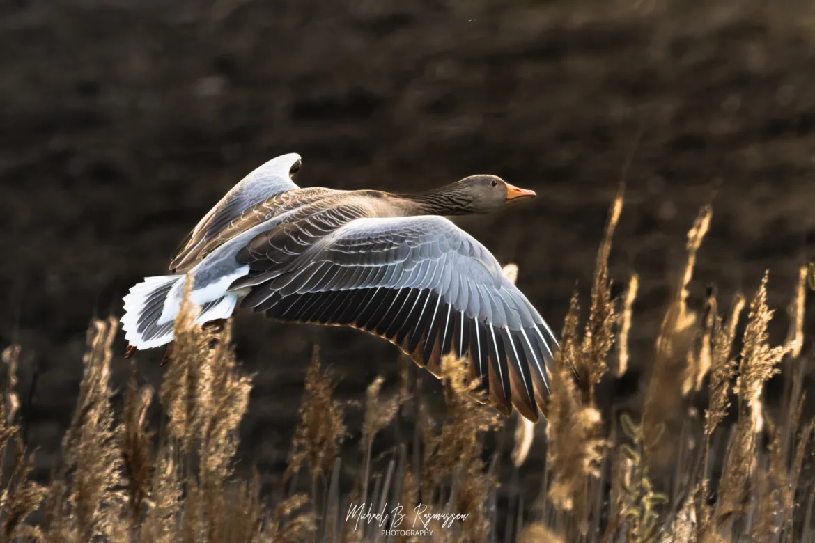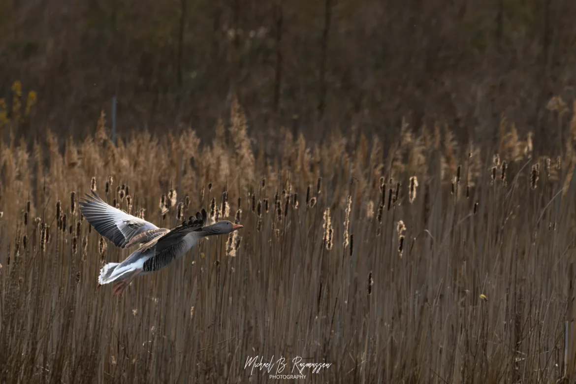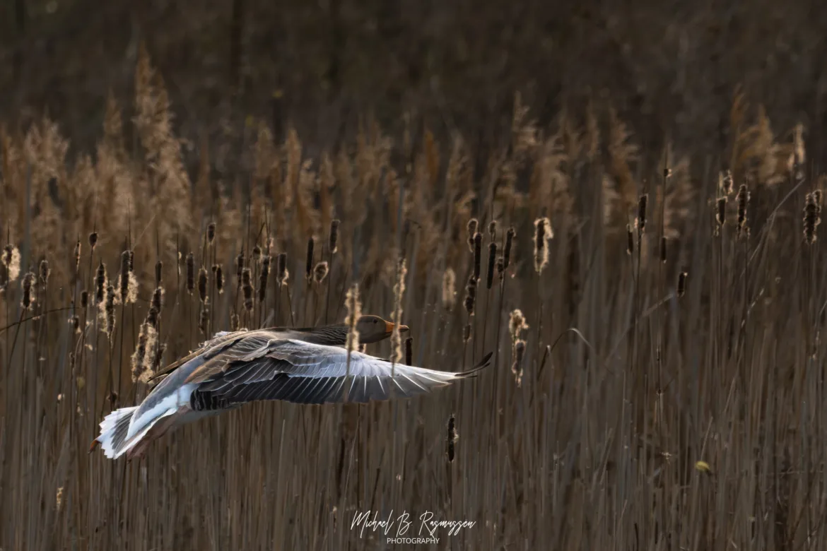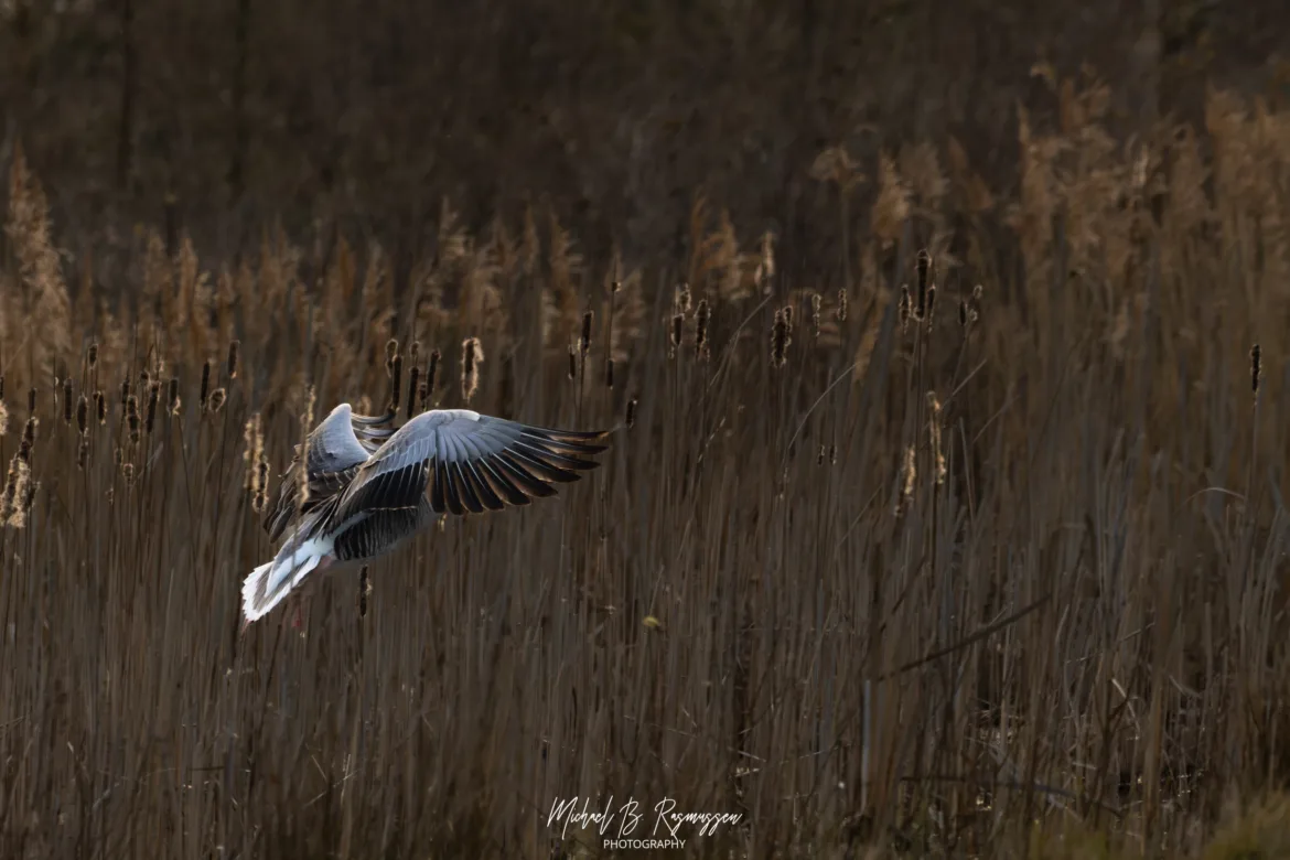 Højdepunktet på turen var uden tvivl mødet med en flok gæs, der besluttede sig for at lande på søen midt mellem de gyldne, høje siv. Som fotograf kender man følelsen af spænding, når man kigger på kameraets lille skærm og ser, hvordan lyset arbejder med motivet.