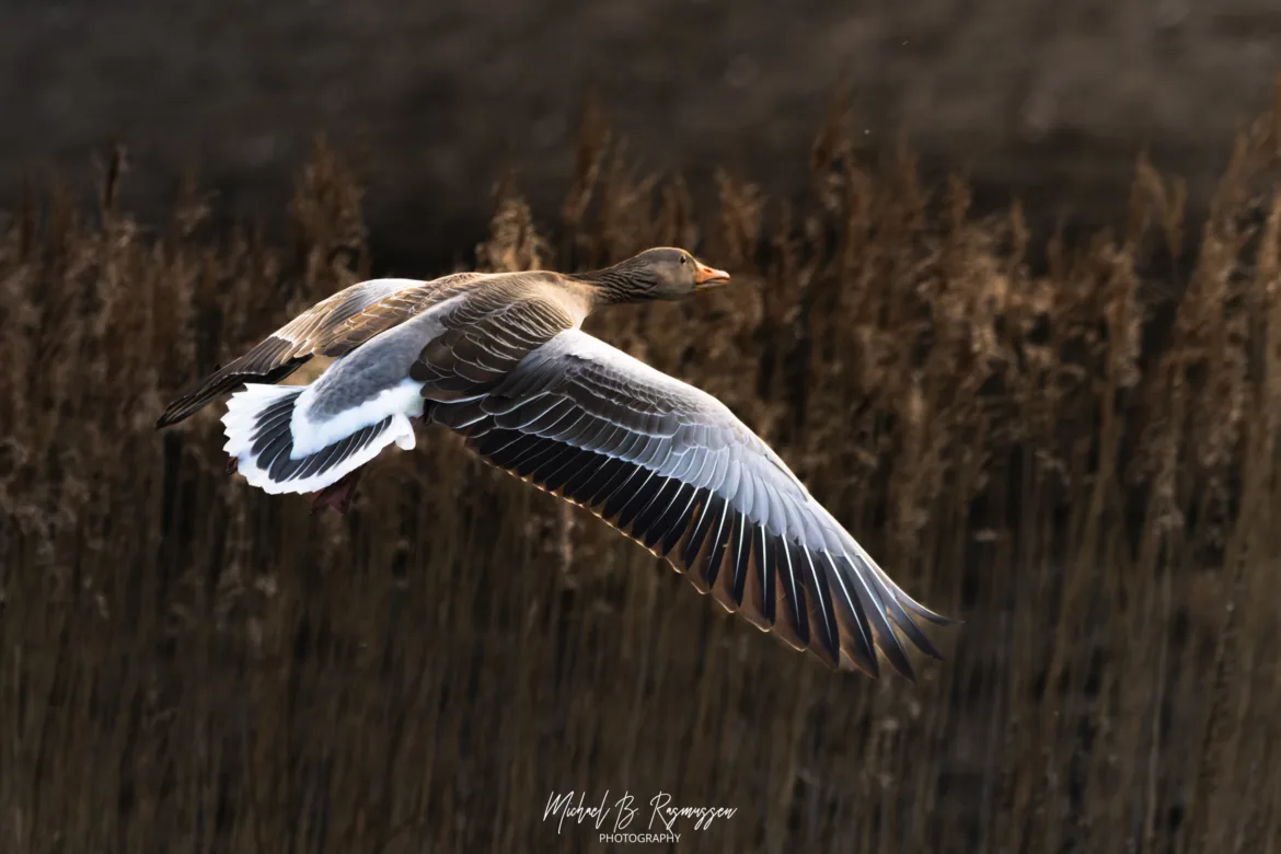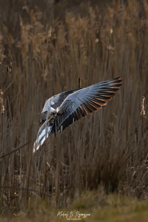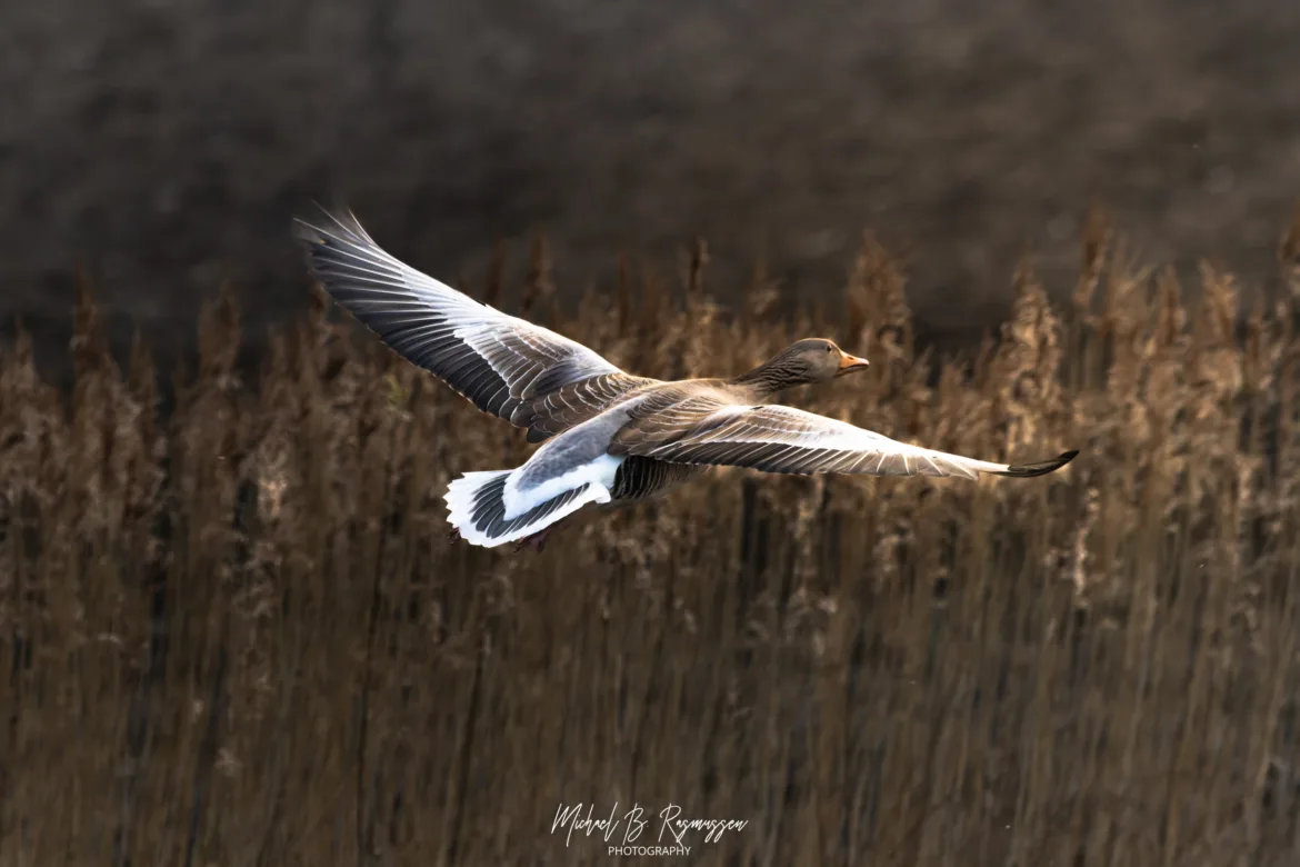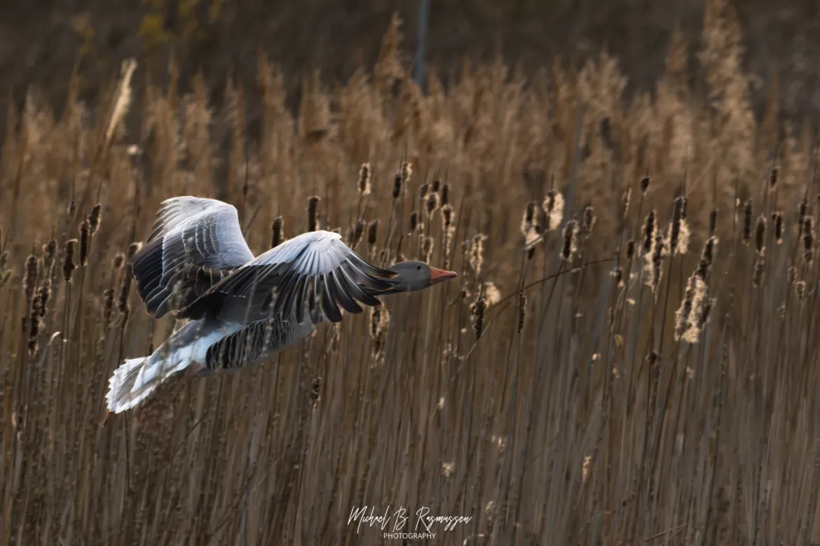 Højdepunktet på turen var uden tvivl mødet med en flok gæs, der besluttede sig for at lande på søen midt mellem de gyldne, høje siv. Som fotograf kender man følelsen af spænding, når man kigger på kameraets lille skærm og ser, hvordan lyset arbejder med motivet.