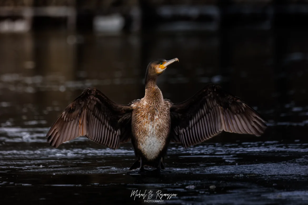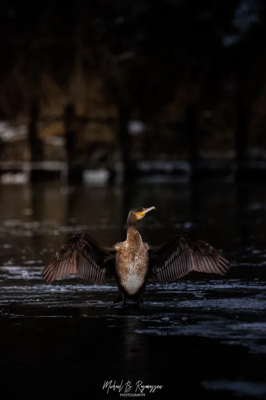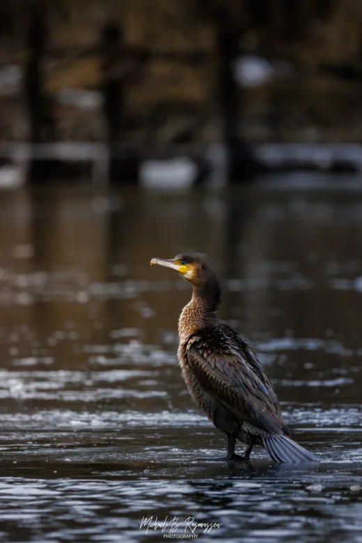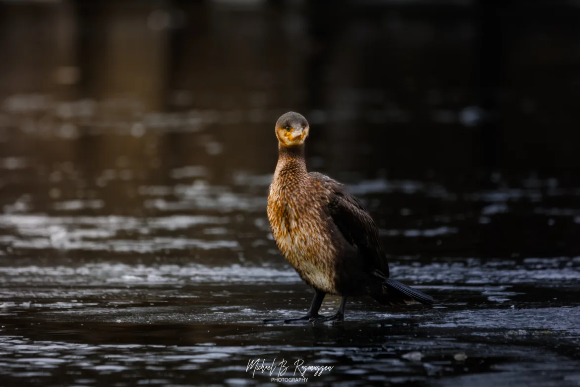 Nede ved kanalen og den store sø var der anderledes roligt, men bestemt ikke tomt for liv. Skarven stod karakteristisk og tørrede sine vinger – et nærmest statuarisk syn mod det mørke vand. Den fik selskab af en flok stor skallesluger; hunnerne med deres karakteristiske brune “frisure” er altid utroligt fotogene, uanset om de glider gennem vandet eller tager et hvil på isranden.